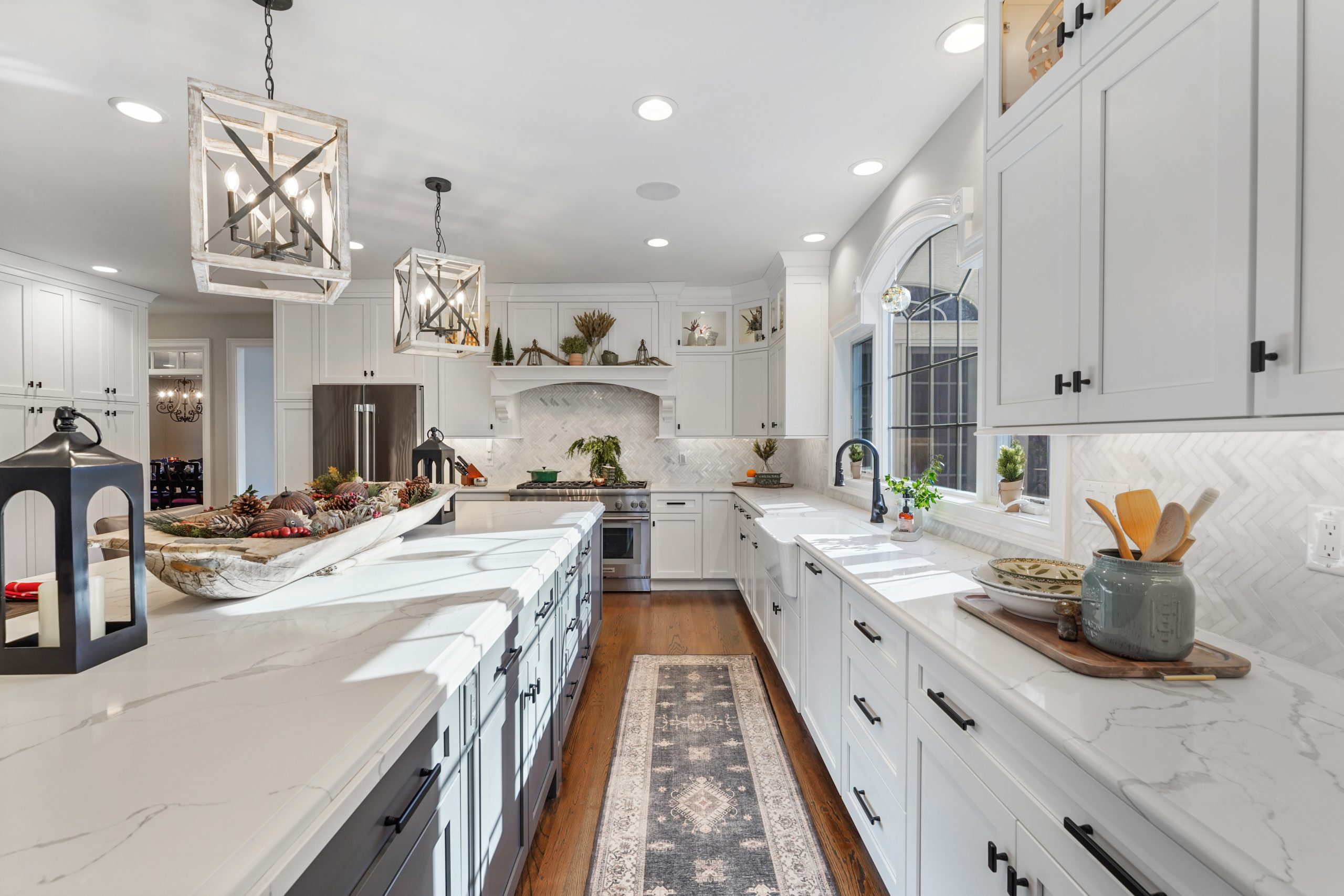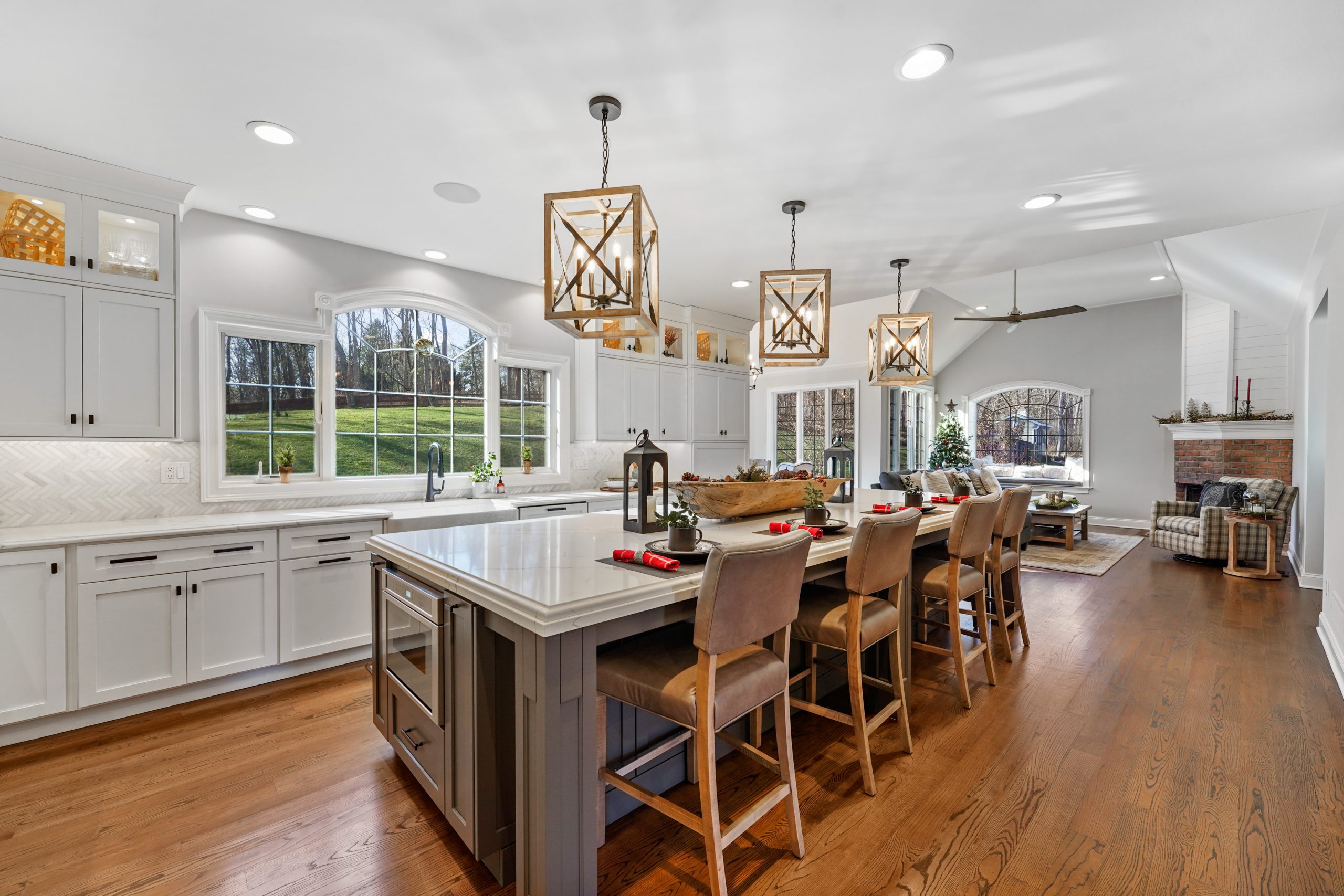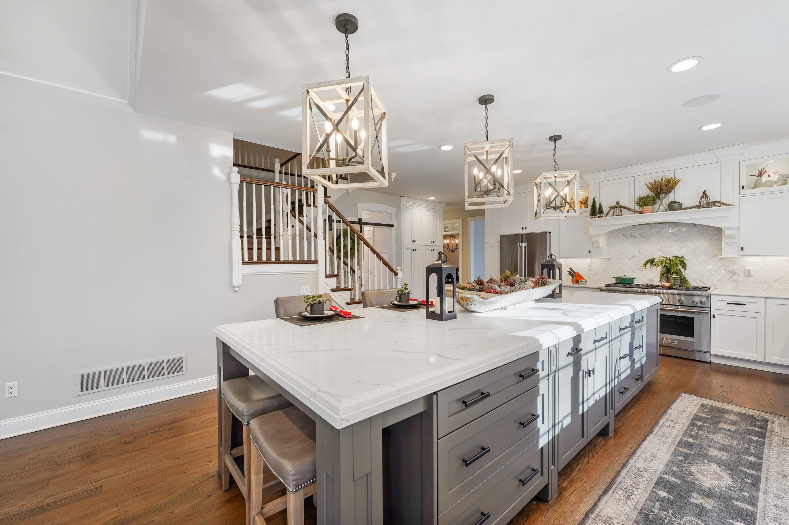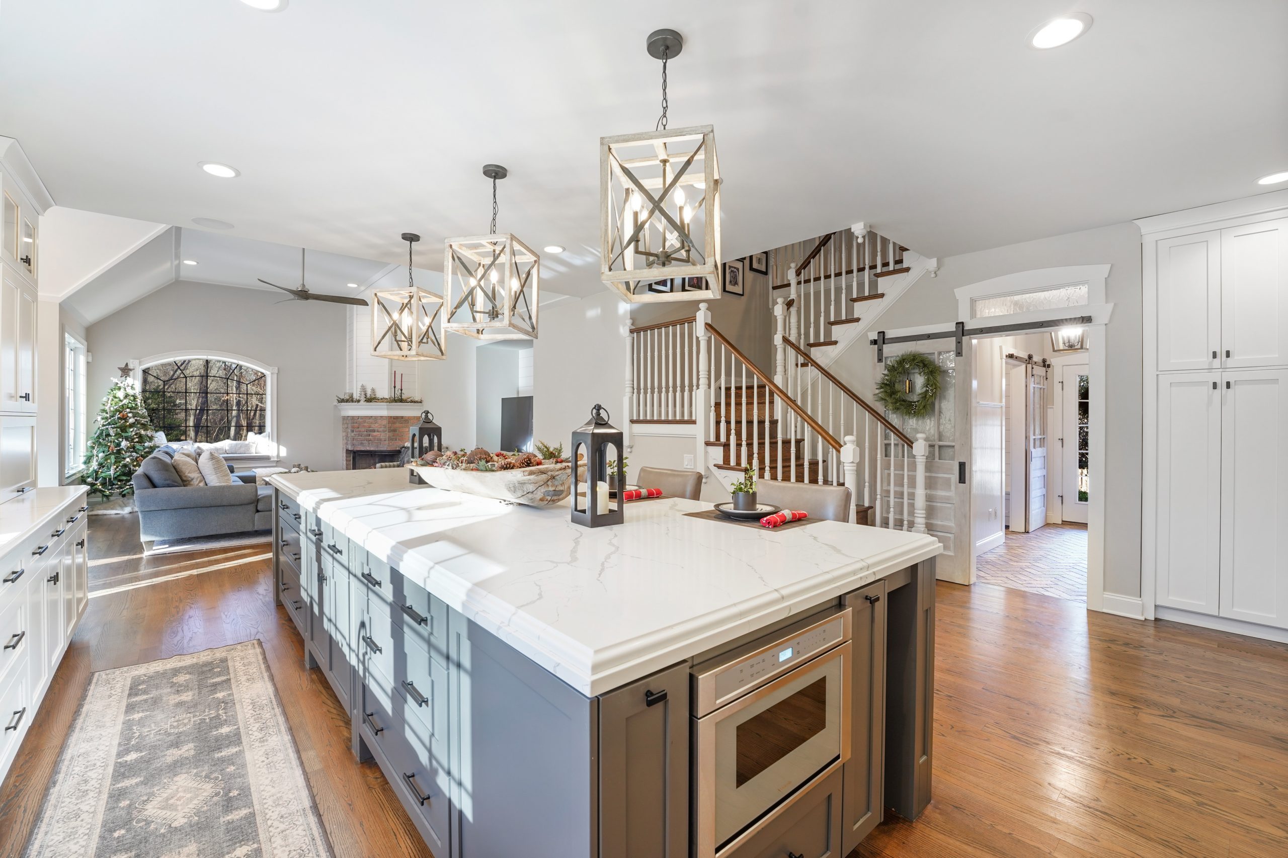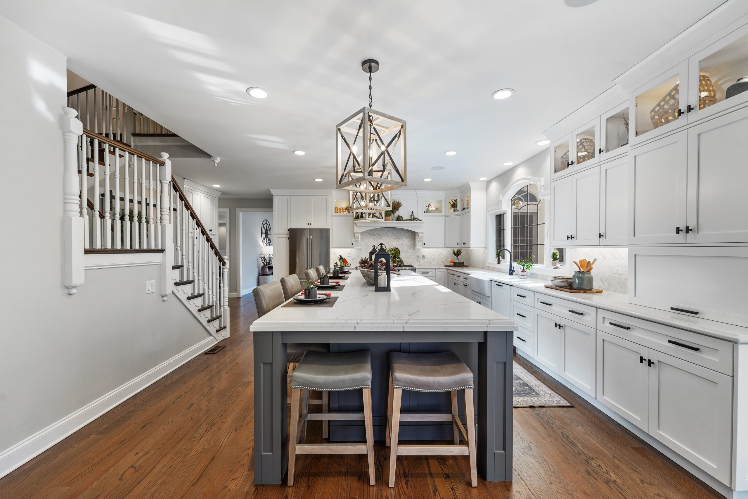Kitchen renovations are the most popular renovations that we see. This is the area of the home where all families gather and spend the most time. For this project we had the space we needed without any additions so the focus became the design and colors of the kitchen to maximum the potential of this home. The growing trend seems to be large islands and this kitchen may have the largest island we have built. Along with the kitchen, trim updated were done in the keeping room, new brick floors were installed in the mudroom and study, the Owner’s Suite was redone with ship lap walls and ceiling, and all the site finished hardwood floors throughout the home were sanded down and restained.
